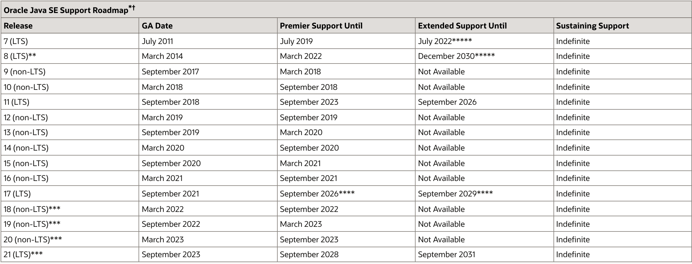 LTS (Long Term Support) Oracle은 Oracle Lifetime 지원 정책 에 설명된 대로 Oracle Java SE 제품에 대한 Oracle Premier Support를 고객에게 제공한다. Java SE 8 이후의 제품 릴리스의 경우 Oracle은 특정 릴리스만 LTS(Long-Term-Support) 릴리스로 지정한다.Java SE 7, 8, 11 및 17은 LTS 릴리스이다. 오라클은 향후 2년마다 LTS를 출시할 계획이며, 이는 다음 LTS 출시가 2023년 9월에 Java 21이라는 것을 의미한다. Oracle Premier Support를 위해, non-LTS 릴리스는 최신 LTS 릴리스의 구현 개선 사항의 누적 집합으로 간주된다. 새로운 기능 릴리스가 제공되면, 이전의 non-LTS 릴리스는 대체된 것으로 간주된다.예를 들어 Java SE 9는 non-LTS 릴리스였으며 즉시 Java SE 10(non-LTS)으로 대체되었다. Java SE 10은 즉시 Java SE 11로 대체되었다. Java SE 11은 LTS 릴리스이므로 Oracle 고객은 Java SE 12가 릴리스되었더라도 Oracle Premier Support 및 정기 업데이트를 받게 된다. 출처 : https://www.oracle.com/java/technologies/java-se-support-roadmap.html